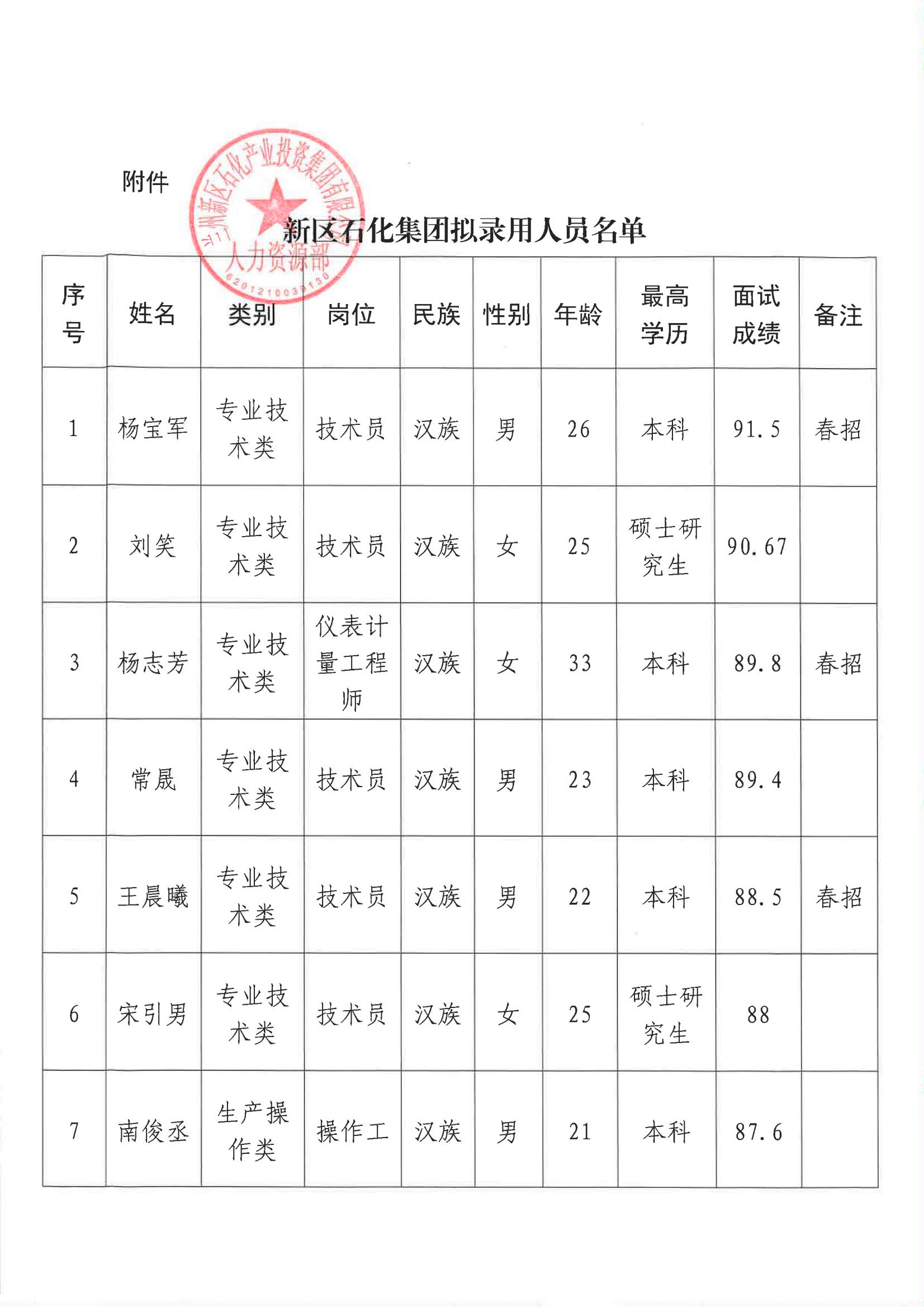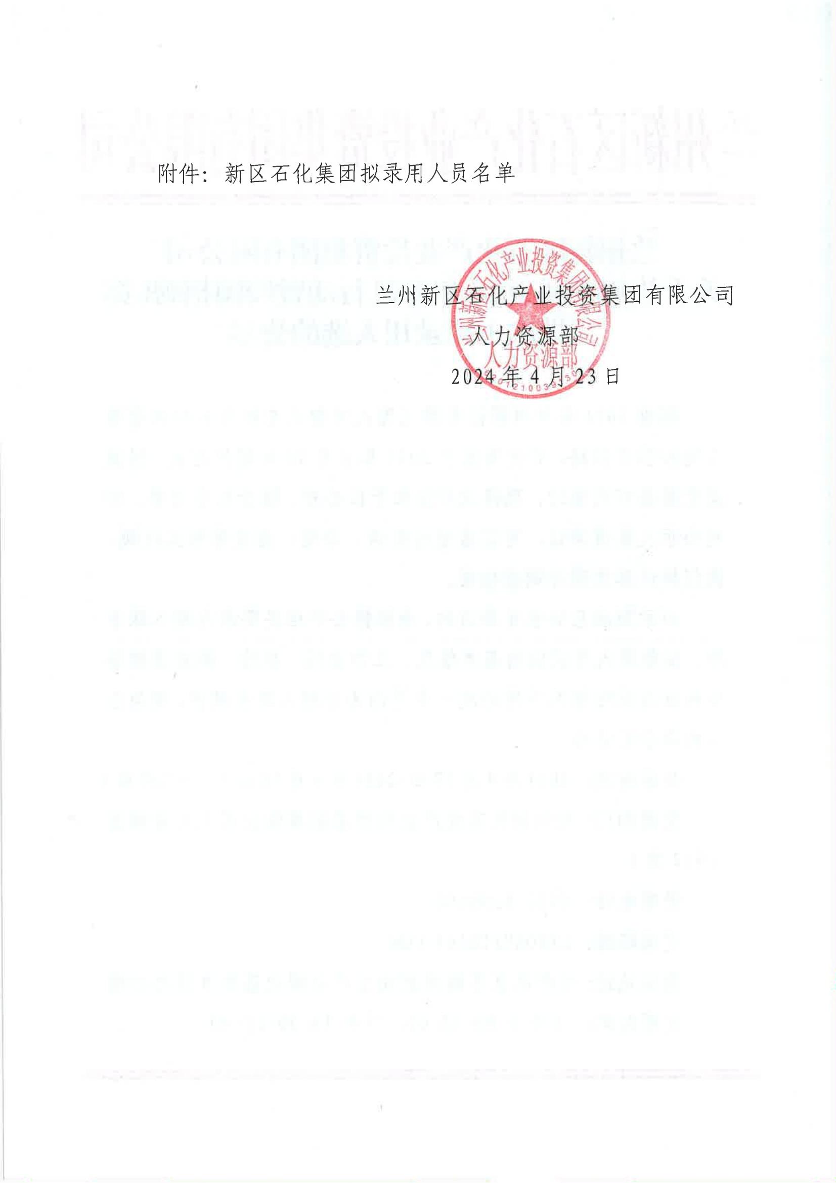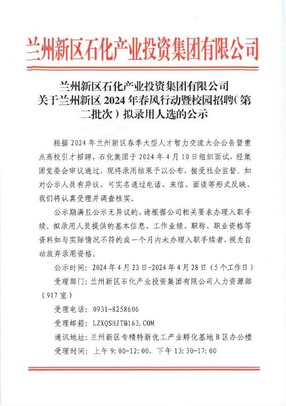 蘭州新區(qū)石化產(chǎn)業(yè)投資集團有限公司 關(guān)于蘭州新區(qū)2024年春風(fēng)行動暨校園招聘(第二批次)擬錄用人選的公示
